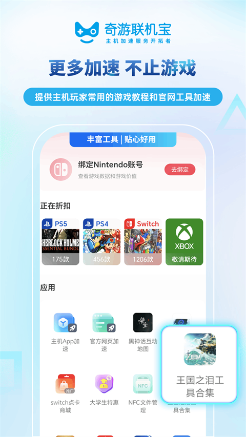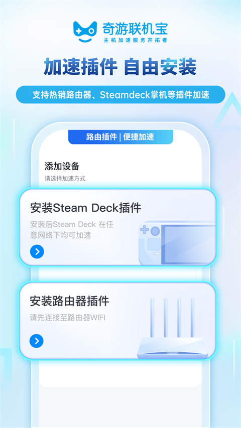 【支持手机加速】 支持手机热点或者WI-FI加速Switch,随时随地开启Switch游戏下载联机新体验! 【支持Steam Deck插件加速】 快捷安装,无需繁琐硬件,畅游Steam Deck联机游戏世界! 【支持路由器插件加速】 手机连接家庭WIFI,自动识别并安装路由器插件,一键开启全主机平台加速,告别主机游戏下载慢、联机不流畅的糟糕体验! 【奇游联机宝加速盒】 主机加速盒,即插即用,告别繁琐操作,一键优化NAT类型,主机硬核玩家优选!游戏库识别主机类型自动显示,加速智能匹配区服,轻松开启主机硬核畅玩时代!联机宝app PS/XBOX主机连接教程