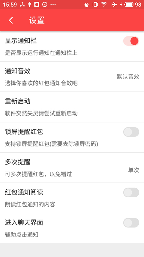 1、极速抢红包:智能优化手机内存和反应速度,真正光速抢红包。 2、自动解锁屏幕:实现随时随地微信QQ秒抢红包,逢年过节必备的微信QQ! 3、声音提醒:超可爱的声音提醒,让抢红包不再单调。 4、震动通知:不打扰身边的安静气氛,更具人性化。 5、红包统计:今天抢了多少,昨天抢了多少,做到心中有数。 6、界面简洁:操作简单,极易上手。更新日志