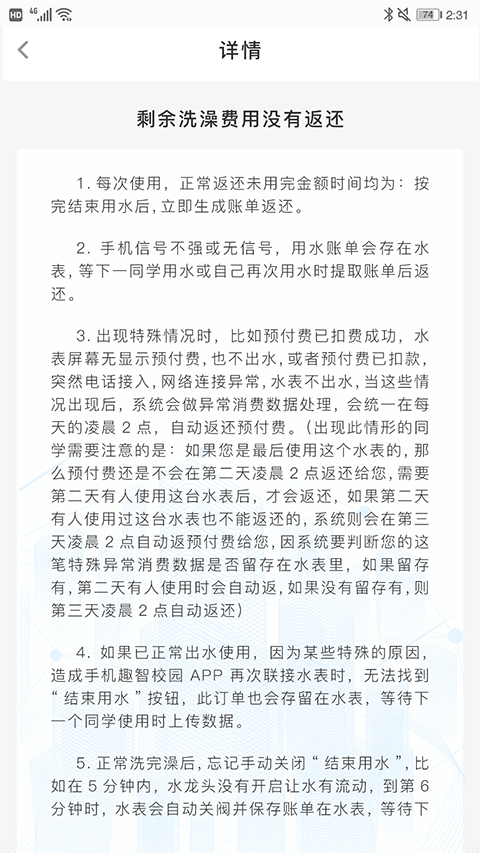 1、快速为您找到学校附近可以使用的热水设备 2、不用再进行挂失、补卡等操作了,账户金额也不会丢失 3、直接使用手机就可以使用热水,非常的方便快捷 4、您所有的消费条目都非常的清晰,满足用户的使用需求 5、使用非常的方便,全都是在线自动扣费,没有复杂的操作 6、您的余额不足直接可以在线充值,不需要任何的线下排队充值节水的小窍门
