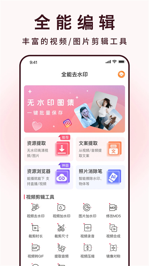 1、【快速去水印】 仅用手指轻轻涂抹就能实时去除想去除的水印,快速便捷 2、【高级去水印】 用于去除复杂背景上的水印,更加细腻,减少违和感 3、【加水印贴纸】 全能去水印app可以给视频图片自由添加水印模板或是图片贴纸 4、【实时滤镜】 高清滤镜,拍美食,拍萌娃,拍风景,根据场景推荐滤镜,随手拍都是大片功能介绍