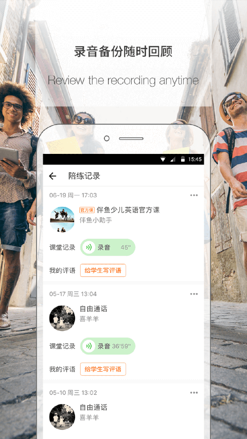 1、陪练 100%真人在线陪练,汇聚中外各国口语达人。 2、实时 实时语音在线交流,真实场景边学边用。 3、自由 自己定制学习计划,个性安排陪练时间。 4、录音 自动录音陪练纪录,随时回顾学习效果。伴鱼教师版App使用教程