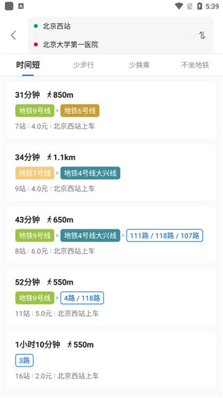 2、然后通过选择时间短、少步行、少换乘、不坐地铁等出行选择路线;