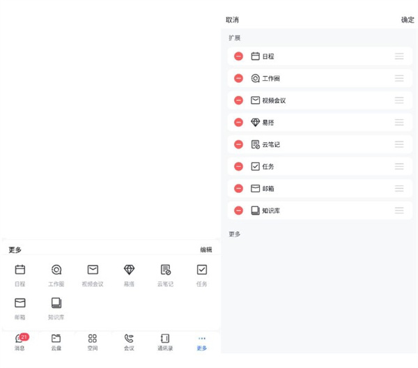 2、点击底部导航栏更多按钮,可以展开查看其他的菜单数据点击编辑按钮,可以进入导航编辑页面,可以将不需要的菜单进行收起,可以变更导航的排序