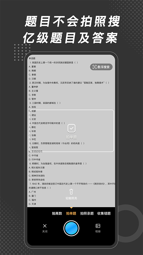 1、提升学习效率 一个题库假设有1000题,刷一遍后,错题有100题,不太熟悉的收藏题有100题,后面只需要刷这200题,能大大提高学习效率。 2、模拟考试 测试自己的学习效果,自己选择题型和每种题型的分数,组卷进行真实的考试模拟。 3、题集市 可以通过搜索的方式,搜索其它用户做好的题库。支持文本搜索,语音搜索,拍照搜索的方式找到相对应的题库。 4、错题本 自动记录错题本,精准复习备考。 5、记忆卡 可通过正反面的记忆卡来加深记忆,用来背英语四级单词,六级单词。软件功能
