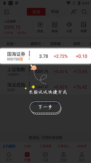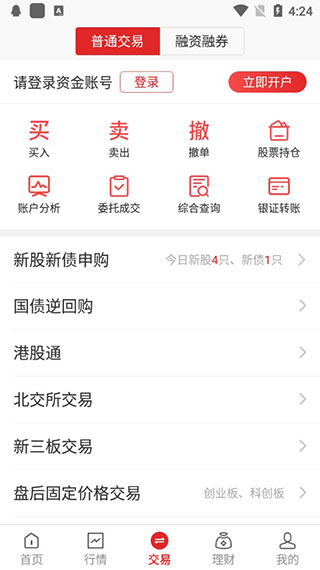 1、【在线交易】 兼具普通交易和闪电交易,普通股票包括股票买卖、新股申购、基金申赎、债券回购、银证转账、账号查询、融资融券等交易功能满足您的投资者需求;闪电交易,可用在个股分时页快捷下单,节省超过30%的下单时间,交易快人一步。 2、【咨询研究】 提供强大的资讯内容,囊括财经热点新闻、行业动态、个股机会、新股资讯、数据掘金、港股、美股、基金、理财等全面的资讯内容。 3、【实时行情】 提供沪深港高速行情,以及基金、债券、期指、外盘各类证券市场行情;拥有强大的图标分析功能及自选股个性化管理功能,个股基本财务指标、公告信息、大单流行等查询功能。更新日志