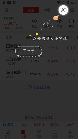 2、进入国海证券金贝壳软件后,点击搜索旁边的按钮可自由的切换字体的大小;