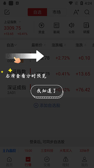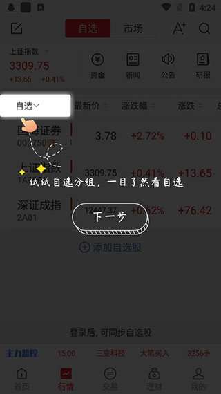3、而点击自选功能,可以一目了然的查看自选股票;