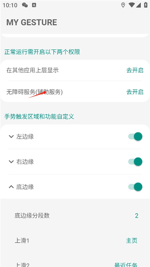 1、扩展面板 在MyGesture的设置里左、右、底边缘任意选择一个手势方向设置为‘扩展面板(Pro)’,然后在任意界面,可以通过该方向手势呼出扩展面板,在面板里,你可以打开你所设置的常用应用,亦可调节音量、调节亮度、快速进行网页搜索等。 2、上一个应用 可以使用默认底边缘左右滑动来回切换上一个应用和当前应用(需先在高级设置内开启)。也可以自定义手势里设置一个手势为‘上一个应用’,来打开上一个应用。不想被上一个应用打开的,比如:输入法等请到‘高级设置’里设置应用切换黑名单。 3、底边缘左右滑动切换应用 可选择切换上一个应用和滑动选择切换,滑动选择切换在滑动底边缘后不要松手连续滑动,可以在显示的最近应用列表内来回切换选择,松手后打开选择的应用,上滑取消。 因权限原因,无法直接读取系统最近应用列表内容,可视化切换应用列表是手势启动后按时间记录的所有出现在窗口的应用,和系统最近应用列表略有出入(最近应用里划掉的应用仍然会出现在可视化切换列表内,权当系统最近任务的一个补充,可方便切换到一键清理后的最近使用应用),可将不希望出现在切换列表的应用加入到应用切换黑名单,如输入法等。 小技巧:最近应用列表初始显示的位置取决于滑动起点和终点的位置,所以可以通过控制初始滑动方向来快速切换应用。 4、过渡动画 现有三种可选:跟随手势‘平移’、跟随手势‘缩放’、平移+缩放。选‘无’为系统自带过渡动画。这些过渡动画设置仅作用于通过手势回桌面/通过手势打开应用/通过手势切换应用。(有些全面屏机型返回桌面的动画有强制控制,回桌面过渡动画设置可能无效。另小部分机型选择回桌面的动画会导致桌面闪退的,请开启设置内的“兼容home键”选项,开启后回桌面动画设置无效。) 5、新通知边缘显示闪光 显示边缘闪光期间点击两侧边缘触发区可以直接打开通知。此边缘显示闪光亮屏时有效,同时闪光次数的设置也是仅作用于此。需按提示授权MyGesture的通知使用权。 6、新通知息屏显示闪光 显示息屏闪光期间点击中心图标可以关闭息屏显示,解锁可以直接打开通知。建议通过“设置显示边缘闪光的应用”勾选需要通知的应用。 7、禁止触摸 通过扩展面板添加,开启此功能后屏幕的触摸操作将被阻挡。禁止触摸时双击屏幕可以切换黑屏和透明阻挡层,在屏幕上画一个◯后解除禁止(可多次尝试,需尽量圆一点),禁止和解除都有吐司提示。 8、应用抽屉 自定义一个手势打开应用抽屉,然后到高级设置-应用抽屉管理,添加应用到抽屉。 抽屉应用排序方法: ①添加应用时,先选择的排在前面。 ②在抽屉页面长按应用后拖动排序。 9、内存优化 开启此项后,会强制回收扩展面板和应用抽屉等界面占用的内存。影响:扩展面板和应用抽屉的启动速度会有所减慢。 10、底边缘分段 按设置的分段数等分底边缘触发区。设置3段即把底边缘触发区等分3段,上滑1,上滑2,上滑3手势功能设置对应左中右三段触发区功能。若设置成1段,则整条底边缘上滑都为上滑1的功能。 11、兼容home键 若返回主页手势正常工作,不要开启此项!此项是为了兼容部分机型返回桌面手势无效,另外开启此项可能会导致回桌面时打开扩展面板或抽屉时延迟弹出。 12、长按并滑动手势 通过调整“长按并滑动超时时间”来调整此手势触发的灵敏度,时间太短容易和默认滑动手势冲突,建议300ms以上。 13、小横条点击和长按 这两个操作可能会受系统边缘防误触的影响而降低触发成功率,若有开关可以关闭系统的边缘防误触的请权衡关闭之。小横条长按触发的时间取决于手势内的“长按时间”设置。MyGesture全面屏手势软件怎么用