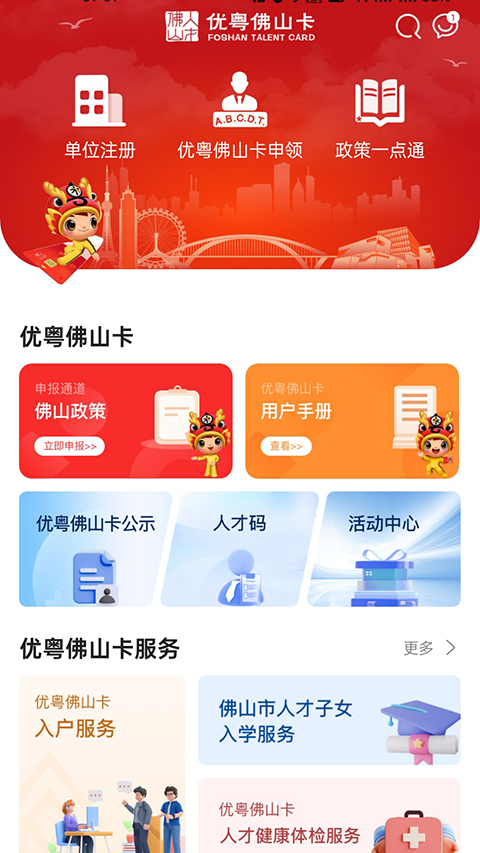 优粤佛山卡app是一款由佛山市人力资源和社会保障局指定唯一的佛山人才移动服务客户端。用户可根据该软件的人才分类认定政策来对全市各类人才进行分类评价,根据人才的学历、职称、职业资格、能力、业绩、荣誉及社会贡献等方面,将人才分为A、B、C、T四类人才。认定为人才后,可享受人才服务和权益。该软件除了面向全市各类人才提供人才分类认定和人才扶持政策申请发放之外,还提供了优粤佛山卡申领、人才咨询、人才专属服务等功能,随着平台不停地完善,平台向人才提供“政务+创业+医疗+住房+商旅+联谊”六位一体全面贴心的服务。特别是就在佛山工作的您,如果在佛山有这样一张卡,持卡人不仅可享相应人才津贴,还有子女入学、住房、就医等差异化服务,非常实用。除此之外,它还是佛山市人才享受优惠便利服务的凭证,同时也是具有金融功能的银行卡,可结合移动应用端使用,欢迎有需要的小伙伴前来下载使用!