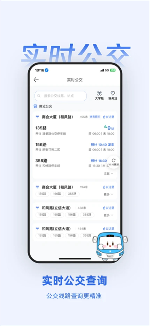 1、智能的公交站台查询:附近的站台一目了然,还能随时随地在线搜索站台 2、便捷的公交教线路查询:出门坐哪辆车一查便知,车辆经过哪些站也可以轻松查到 3、准确的车辆实时到站信息:可以不用等待,计划出行,节省自己的时间 4、本地信息咨询聚合:丰富您的都市生活 5、失物招领:您在车上丢了啥,这里可以帮你找到软件特色