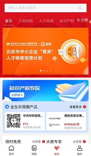 用户在服务页面,可以进行知识产权、人力资源等专利进行购买,也有许多软件、法律等服务可以购买。