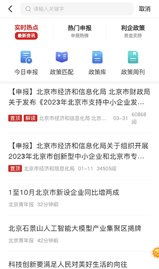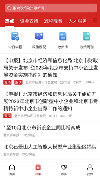用户可以点击下方政策,查看北京市的热点政策,以及资金支持、减税降费等实时政策,有助于帮助企业快速了解政策,做出相应的改变。