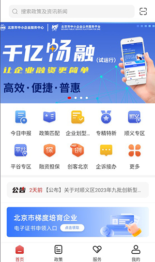 用户在登录完之后会进入到首页,可以进行今日申报、政策匹配等多种多样的功能服务,也可以查看当前的热点资讯。