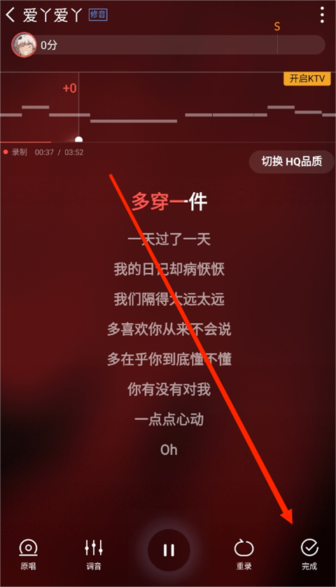 3、搜索你喜欢的歌曲,找到后点击K歌按钮,唱完后点击右下角完成;
