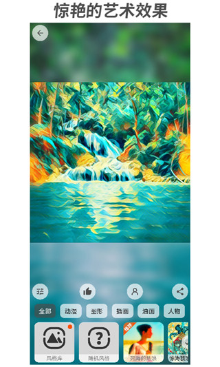 1、丰富的艺术过滤器:免费使用,持续更新 2、惊艳的艺术效果:震撼的视觉冲击力,让你耳目一新 3、领先的AI技术:稳定、快速的边缘计算神经网络 4、隐私保护:照片和作品只在本地处理 5、强大的图片后处理:可调进行风格化、原色保留比例调整,以及丰富的图像调色功能 6、社交媒体分享:支持微信、微博转发分享软件功能