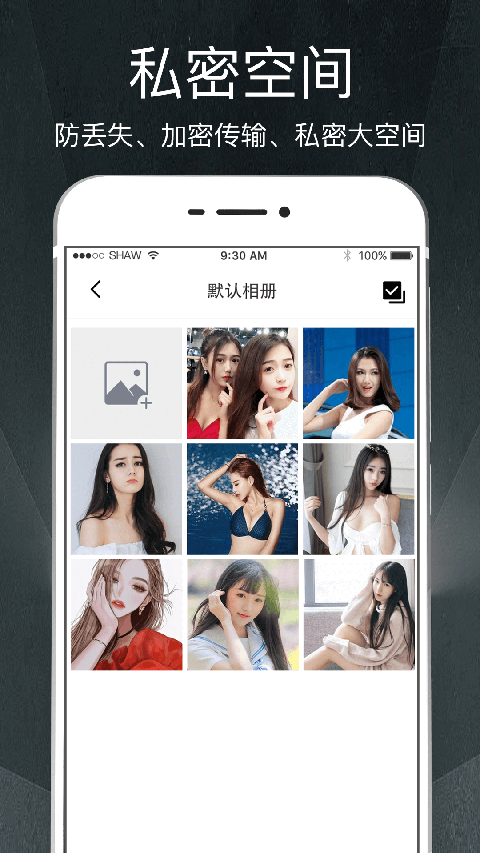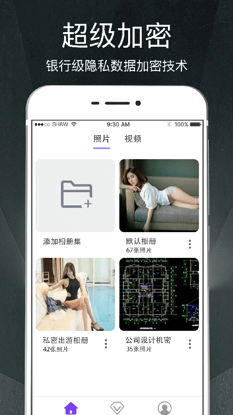 1、快捷:批量导入导出照片\视频,相册分类管理。 2、加密:经过行业认证的专业的加密处理,除了自己任何人无法查看。 3、隐私:多重保护,强大的密码保护&贴心的伪密码功能,,只属于您一个人的空间。 4、备份:安全云备份,换手机照片视频轻松转移。 5、靠谱:照片\视频无损保存,不限数量。 6、简洁:风格清新,简洁的UI设计,易操作。更新日志