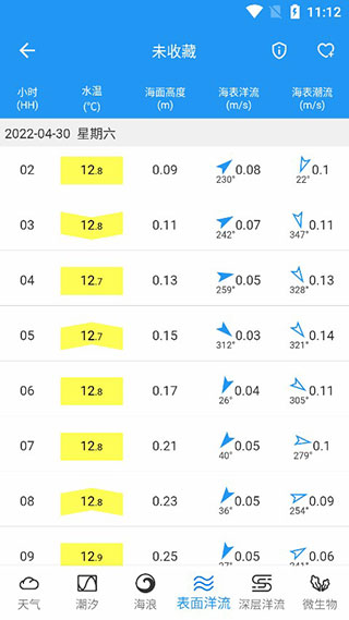6、数据地图,可以查看全球的海表潮流、速度、方向、水温、海表面高度,点击详情查看天气、潮汐、海浪、表面洋流、深层洋流、微生物。