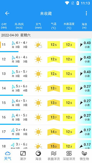8、天气查看小时、风-阵风、天气、气温、水面湿度、海浪。