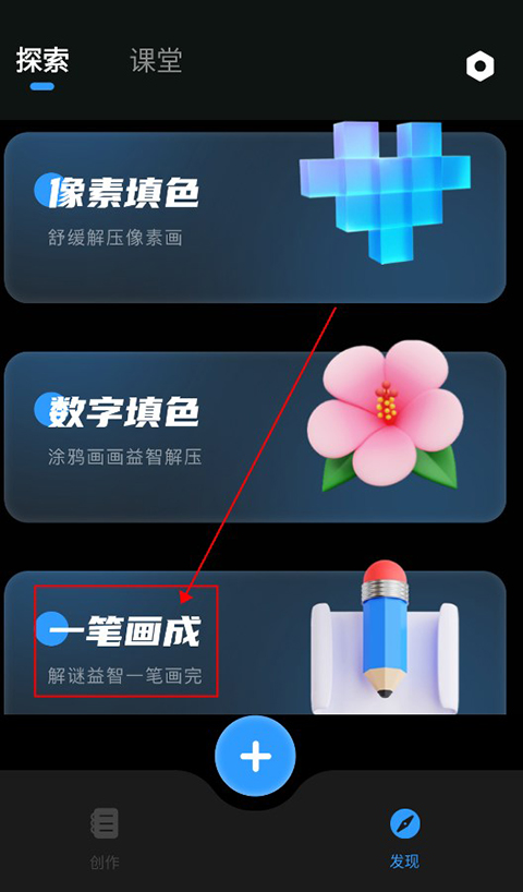 1、用户在本站下载并打开软件后,点击下方的发现,再点击“一笔画成”。