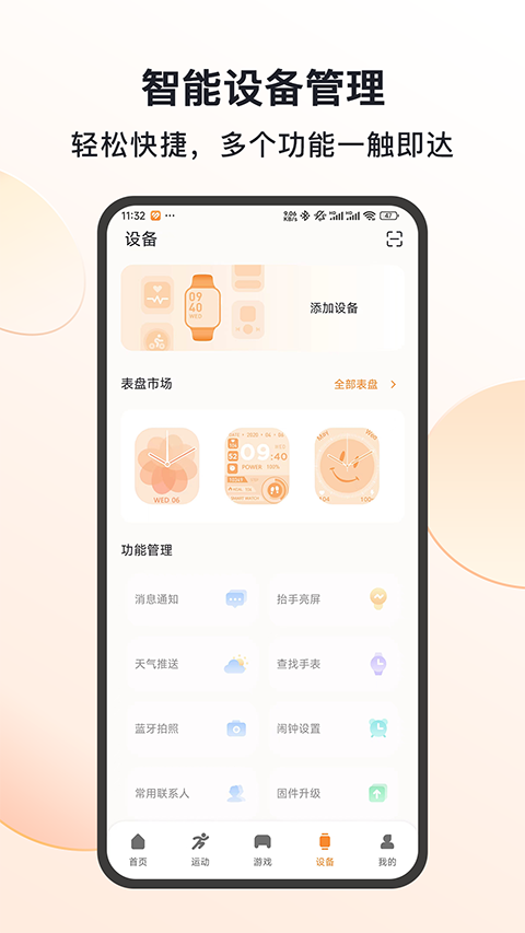 1、【运动数据】 每日运动的数据都可通过软件查看,了解到详细的运动情况信息。 2、【信息通知】 出现了异常数据会自动通知你,再也不用担心自己无法知晓信息了。 3、【设备管理】 用户在软件中可对自己的设备进行管理,给你带来了更多的管理便利。 4、【睡眠数据】 每天都可以在上面查看到自己的睡眠数据,实时知晓自己的睡眠情况。软件亮点