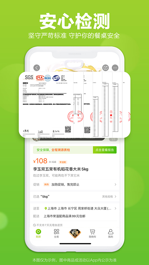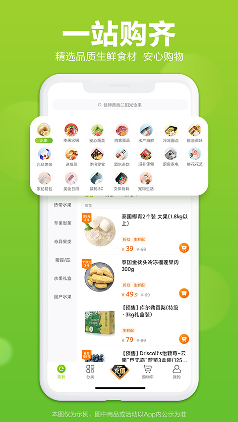 1、蔬菜水果: 包括瓜果蔬菜、速冻蔬菜、国产水果、进口水果; 2、肉禽蛋品: 包括新鲜猪肉、鸡肉、鸭肉、牛肉、羊肉及肉制品; 3、水产海鲜: 包括大闸蟹、虾、贝、鱼、河鲜、海鲜、水产; 4、母婴童: 包括进口奶粉、儿童营养辅食、儿童食品; 5、奶制品: 包括酸奶、牛奶、豆奶、进口牛奶、黄油、奶酪、甜品; 6、粮油副食: 包括米面杂粮、食用油、厨房调味品、干货、营养保健品; 7、休闲食品: 包括糕点饼干、零嘴小食品、坚果、干果、糖果、膨化食品; 8、酒水茶饮: 包括饮料、矿泉水、蜂蜜、咖啡、茶叶、葡萄酒、黄酒、清酒、鸡尾酒、白酒、啤酒; 9、熟食面点: 包括面包、卤味、面点、包子、馒头、水饺、汤圆、混沌; 10、进口食品: 包括进口牛奶、进口奶粉、进口水果、进口牛羊肉、进口海鲜等; 11、有机食品: 包括有机蔬菜水果、有机绿色农产品等。软件亮点