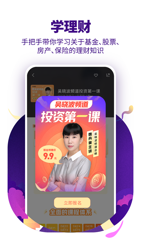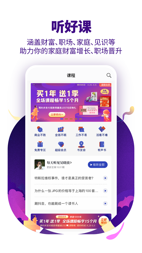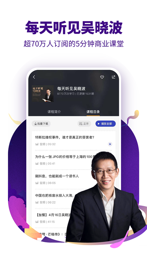 【每天听见吴晓波】 超85万人订阅的商业日课,内容涵盖宏观经济、商业解读、企业经营、高手对谈、好书解读五大模块,不仅能帮你提升商业认知,构建商业思维,还可跟随吴晓波的朋友们,学习企业家的商业思维,深度了解企业经营模式,把握时代趋势,发掘当下商业机遇。 【读好书】 《大败局》《穷爸爸富爸爸》……涵盖商业、经济、人文等经典好书,吴晓波等大咖亲自解读,上班路上听、开车听、睡前听,把有声商业图书馆随时带在身边。 【听好课】 由大学教授、业内专家、媒体人等作为授课老师,系统搭建商业、职场、人文、见识等方向系列课程,从入门到高阶,助力你的个人提升和职场晋升。功能介绍