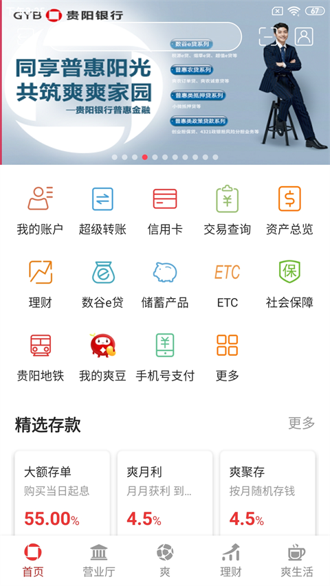 1、转账 转账交易实时到账,免手续费。 2、生活缴费 可以缴纳水、电、煤气、话费、有线电视费、交通罚款、学费、物业管理费、地税及基本社会保险等。 3、信用卡业务 可提供贵阳银行信用卡的申请、激活、还款、分期等功能,贵阳银行信用卡消费积分丰富,分期费率优惠,并有多项刷卡优惠活动。 4、理财服务 可实时掌握理财资讯,不预约、不排队,手机即可随时购买,方便快捷。 5、e贷功能 可随时申请小微企业主及个体工商户贷款,时间更灵活、流程更简单,还可随时查询额度与贷款详情。 6、爽易贷 可申请贵阳银行针对优质客户提供的线上纯信用消费贷款——爽易贷,它可满足您购车、教育、家装、旅行等消费需求,按日计息,随借随还。 7、储蓄功能 可购买贵阳银行“爽商品”增值储蓄产品及“爽得利”等特色储蓄产品,操作简单,安全可靠。 8、云闪付 已开通二维码支付功能,使用手机即可替代您的银行卡,支持银联“云闪付”扫码支付。软件亮点