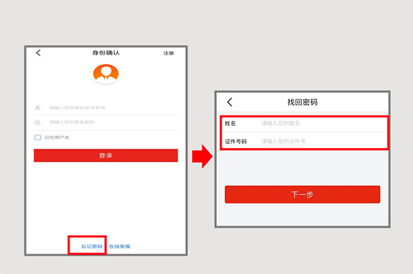 一、修改密码(原手机号可用) 1、若忘记登录密码,进入昆仑直销银行登录界面时,请点击页面下方的“忘记密码”进入找回密码界面;在此界面输入姓名,证件号码后点击下一步。