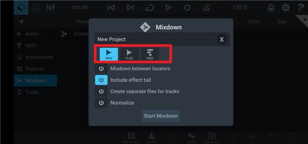 3、然后点开左上角,点mixdown里最上边的create mixdown;