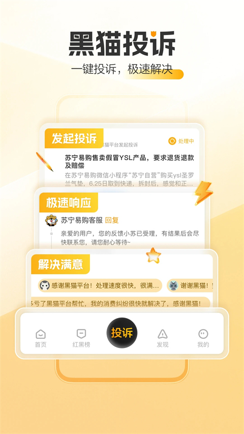 1、微博一键登录 新浪微博拥有亿万量级庞大用户群,黑猫投诉平台与其完全打通,用户无需注册,可直接登录微博账户随时在平台投诉,投诉进度实时微博私信同步。 2、7X24小时处理消费纠纷 及时时间处理投诉案例,与京东、苏宁、街电等企业合作,承诺24小时响应,可使消费投诉得到极速解决。 3、企业信誉全透明 推出红黑榜,企业信誉直观透明地展现在用户面前,帮助用户甄选优质品牌,为消费行为提供依据。常见问题
