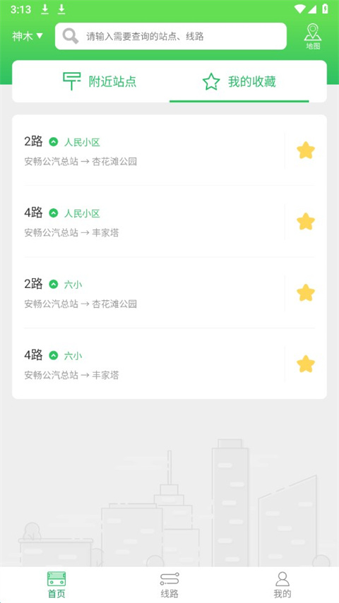 对于常用的线路可以点击线路查询页面右边的收藏按钮(或线路详情页左下角收藏按钮),点击确定收藏后,该线路将会显示在app的首页界面,下次使用直接查看,不用通过搜索查询,大大节省了您的时间和流量。
