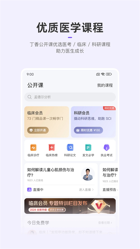 【临床经验】 全国最大的专业医学社区。 医生同行、专家前辈都在这里。 【病例讨论】 常见病、罕见病、各类典型病例。 海量医学影像资料轻松搜索 随时讨论。 【考试晋升】 经验帖、干货帖、精华帖、避坑指南一网打尽。 更有重量级专业课程指导,重点难点轻松get。 【课程学习】 临床课程、科研课程、医考课程、各种公开课尽在掌握。 海量优质医学课程,丁香公开课等你来学习。 【用药助手】 覆盖国内 99% 药品数据,药监局药品信息实时更新。 4000+疾病知识库,覆盖 90% 临床常见疾病,满足各大科室查疾病需求。 收录国内外权威机构发布的指南、专家共识,一站搜索,支持下载分享。软件优势