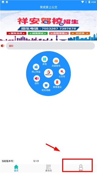 1、下载并安装本站提供的荣成掌上公交app最新版,打开即可进入软件 2、接着首页处选择右下角点击“我的”