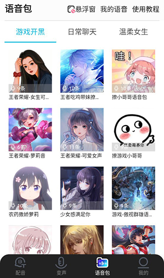 用户在语音包界面可以选择游戏开黑、日常聊天、温柔女生三大语音包进行使用,只需要打开悬浮窗功能即可快捷使用。