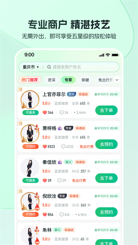 1、提供平台保障,并且不满意直接退款,在调查属实后,直接全额退款。 2、带来的是上门服务,没有时间去专业的SPA店时,可直接预约上门服务。 3、多种不同的筛选条件,如价格、销量、好评度等,都能同时输入,筛选服务。 4、还能直观查看技师的服务状态,方便预约空闲技师,提供一对一推拿服务。 5、所有工具都由技师提供,您只需要下单预约服务,然后就能尽情享受了。 6、还能领取技师发布的现金券,在领用过后,结算账单时就能抵扣现金。更新日志