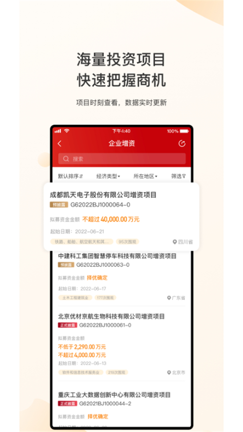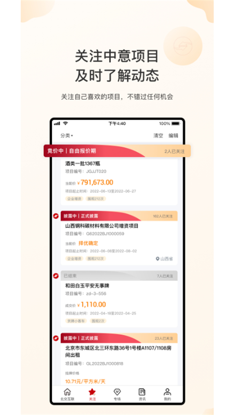 【丰富的业务品类】 业务涵盖企业增资、产权转让、资产转让、房地产、房屋出租、招商、小宗实物、诉讼资产、司法拍卖、金融债权、国际项目、体育、文旅、上市公司、投资意向、土地二级市场、碳交易、经典收藏品、机动车、京牌小客车等。 【强大的服务功能】 提供意向申请、报名、竞价、交费等服务,多种业务线上全自助完成;一键贷款、融资服务、交易管理、保证金管理等功能,使用户尽享更多便捷。 【全面的行业信息】 产权评论、案例分析、行业研究、产权100问等栏目,帮助用户快速了解金融交易资讯,全面读懂产权行业。新北交互联app怎么参加竞价