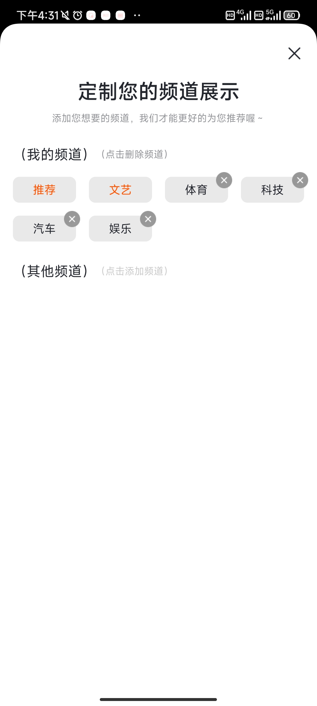 2、点击不喜欢的频道的x号就可以完成删除了。