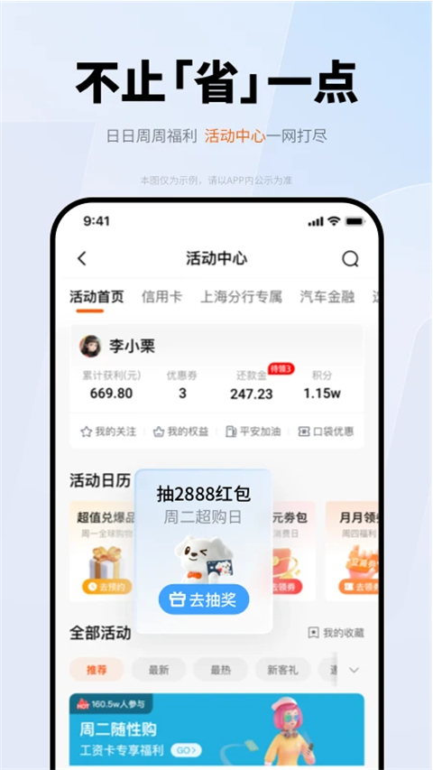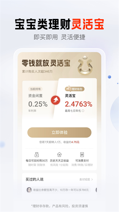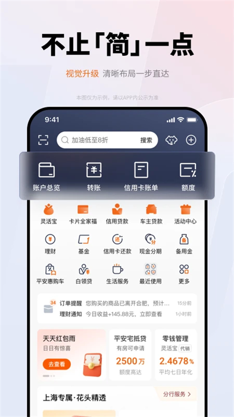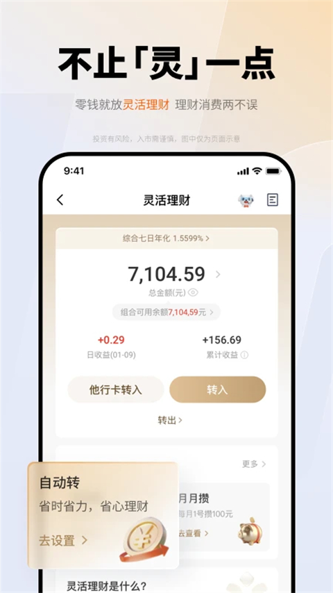 【多赚一点】 覆盖理财、基金、存款、黄金、贷款等产品,打造一站式金融服务。 【多省一点】 涵盖接送机、贵宾厅、高端酒店等商旅出行权益;视频音乐、高尔夫、健身等休闲娱乐权益;跨境汇款、账户安全保障等基础服务权益,还有购票、打车、外卖等第三方生活类权益。 【轻松一点】 界面大幅降噪,优化布局、提高体验。全新多账户、跨平台能力,实现搜索、收藏和服务的一触即达。 【关爱多一点】 大字版全面优化,易理解、好操作,同时提供防骗宝典专区,为老年客户的金融生活保驾护航。功能介绍
