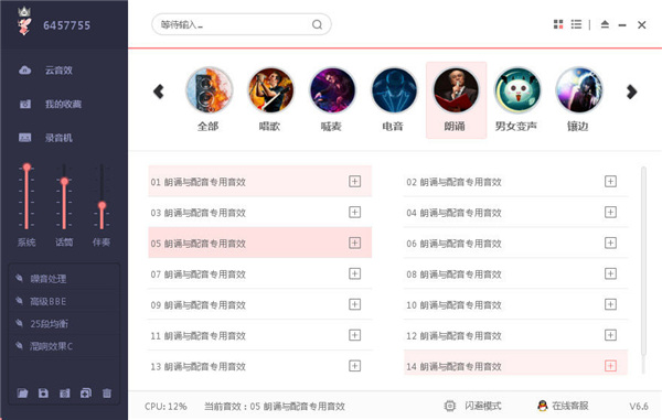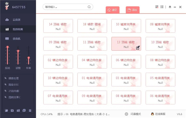 电音精灵免费版是一款支持众多网络语音聊天软件的电音调试软件,电音精灵是一款典型的VST机架软件,主要对于麦克风输出声音的处理,可以广泛应用与网络K歌,MC喊麦等。软件集成大量的VST插件,可以调试出千奇百怪的声音效果,如(电音 闪避 跟唱 爆麦 闷麦 留声机 哇音 变音 主持 跟踪 魔音 合唱 等等),由于它界面友好,操作方便的特点,受到了YY、聊聊、UC、IS、Qtalk 9158等用户的喜爱和支持。内置简易调音台,可调节系统音量,麦克风音量和播放器音乐音量。对于收藏列表里的机架模板项目,可设置键盘快捷键实时控制切换,可修改当前模板名称,也可以进入迷你模式进行加载模板。电音精灵严格遵循混音学中效果器处理顺序,分别是降噪,激励,均衡,混响,压缩,处理后的声音更清晰,更干净,更好听!