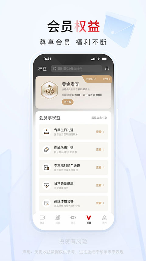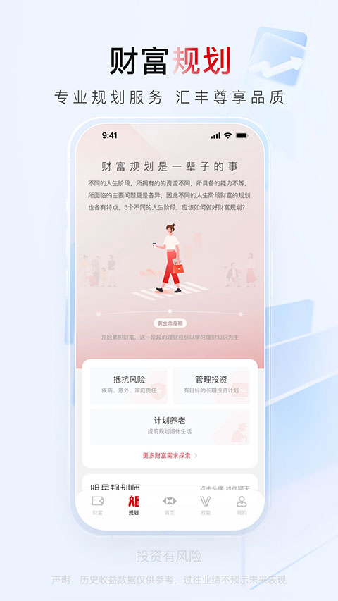 【一站式财富科技服务】 汇集汇丰(集团)在中国的多个实体所提供的金融产品、泛金融和健康服务及客户权益入口,打造汇丰一站式财富科技服务 【汇丰大会员】 尊享专属权益礼遇,权益页面汇丰大会员专属权益及礼遇等您体验,丰盈每刻 【规划服务】 助您实现不同阶段人生目标,支持一键联系您的汇丰银行客户经理/汇丰环球私人银行客户经理/私人财富规划师,集合专业财富规划服务入口与多种财富管理工具 【深度洞察】 汇聚深度洞察与前沿资讯,了解市场动态与形势分析 【丰富活动】 财富活动精彩纷呈,支持线上线下多种互动体验 【全面工具】 基于您的人生规划,提供覆盖养老、教育等多场景的测算工具,满足您的多类规划需求,助力人生梦想更新日志
