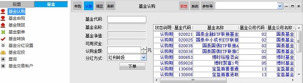 在填写完“基金代码”之后,“基金名称”,“基金净值”,“可用资金”会显现,输入“认购金额”后,点击“下单”会出现确认信息。