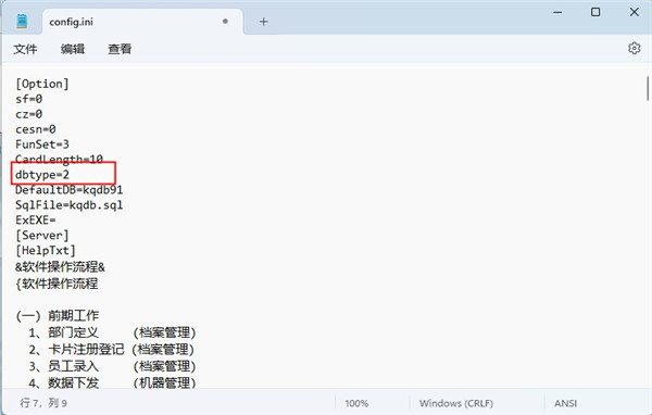 3、双击打开后,把第7项的dbtype=1修改成dbtype=2或3,再把文件保存关掉后。