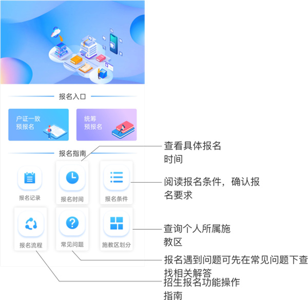 1、从户证一致入口进入【入学报名须知页面】,阅读须知并勾选底部后,点击城区报名;
