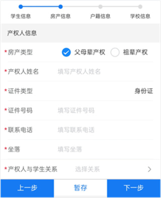 4、填写信息第二步,填写房产信息。先选择房产类型,包括父母辈房产、祖辈房产。完成剩余的信息填写后,点击下一步。