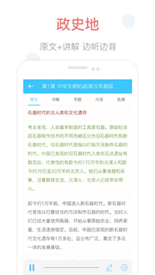 1、课本朗读 有声的高中教材。包含科目:英语、语文、政治、历史、地理。所有教材课本,由优秀播音员录制,课文原文边听、边看、边背,学习背诵更高效。新版教材同步。 2、教材全解 紧扣考纲,同步教材,精讲知识要点,分类考点归纳。重点难点高清朗读,随时点播,充分利用学生的碎片化时间,随时随地想学就学。 3、同步练习 系统设计高效训练,分层讲解解题思路,提升考试能力,考出高分。 4、文科选学 适应新高考改革3+1+2模式,增加了政治和地理两个文科类科目的学习。 5、高考复习 高考一轮复习、高考冲刺视频课程。掌上高中app使用指南
