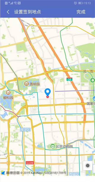 3、签到页面可选择打开“定位位置”,进去签到地点设置页面,设置好签到地点,点击“完成”返回签到