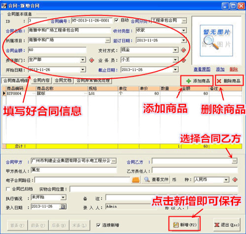 进入到新增合同界面中,首先填写好合同信息。在添加商品,选择合同乙方点击“新增”按钮保存即可。