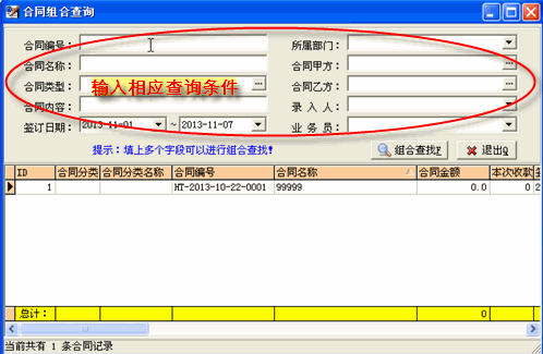 在软件主界面上找到合同查询,点击“组合查询”进入到合同组合查询界面,输入查询条件就可显示合同详情。如下图所示: