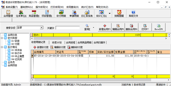易速合同管理软件单机版是由易速软件开放的一款功能全面的合同管理辅助工具软件。易速合同管理软件简单易用,真正地从用户的需要出发,从合同起草、合同签订、合同收付款计划,合同收付,结算安排、执行进展、到实际结款以及对合同结款情况统计分析都有全方位的管理。易速合同管理软件可适合各类企事业单位和门店单位合同管理的需要,软件操作极为简便,高效实用,性能稳定,易速合同管理软件的已经在金融、通讯、制造、贸易、医药、房地产等行业中发挥了重要作用,是您的合同管理的好助手。