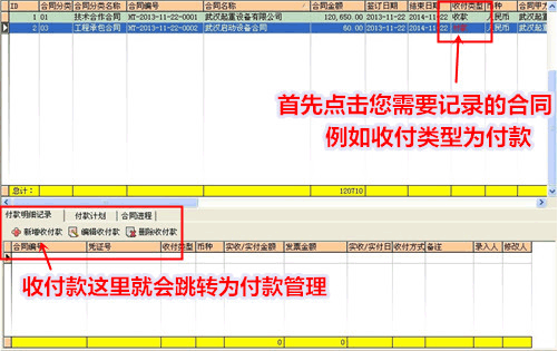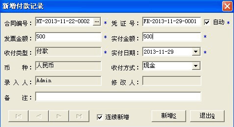 选择合同编号,填写付款金额点击“新增”按钮保存即完成一张付款单据(收款单操作类似)。